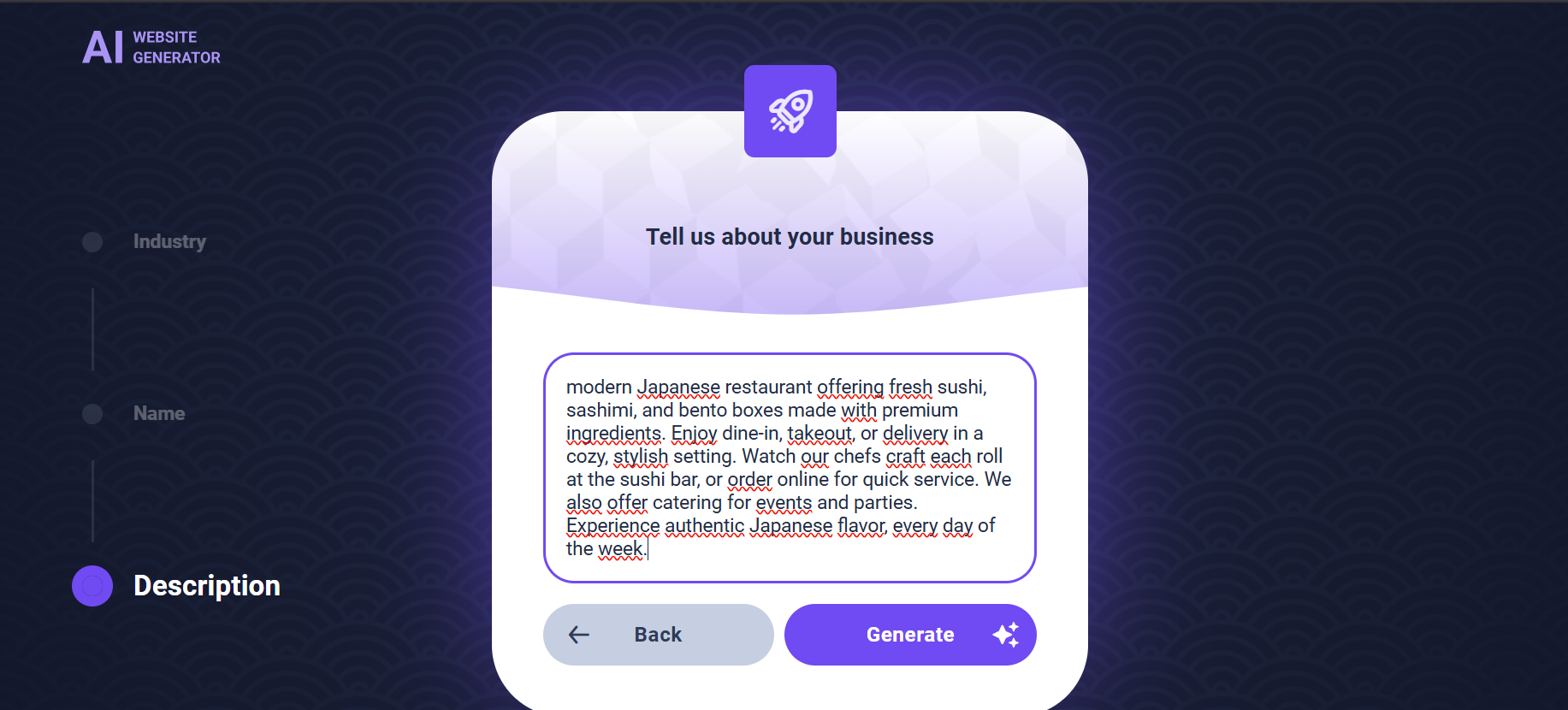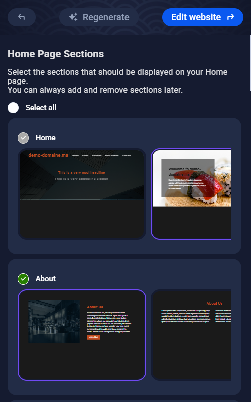 Based on this input, the AI will automatically generate text for your website, including a homepage, about section, services, and more.