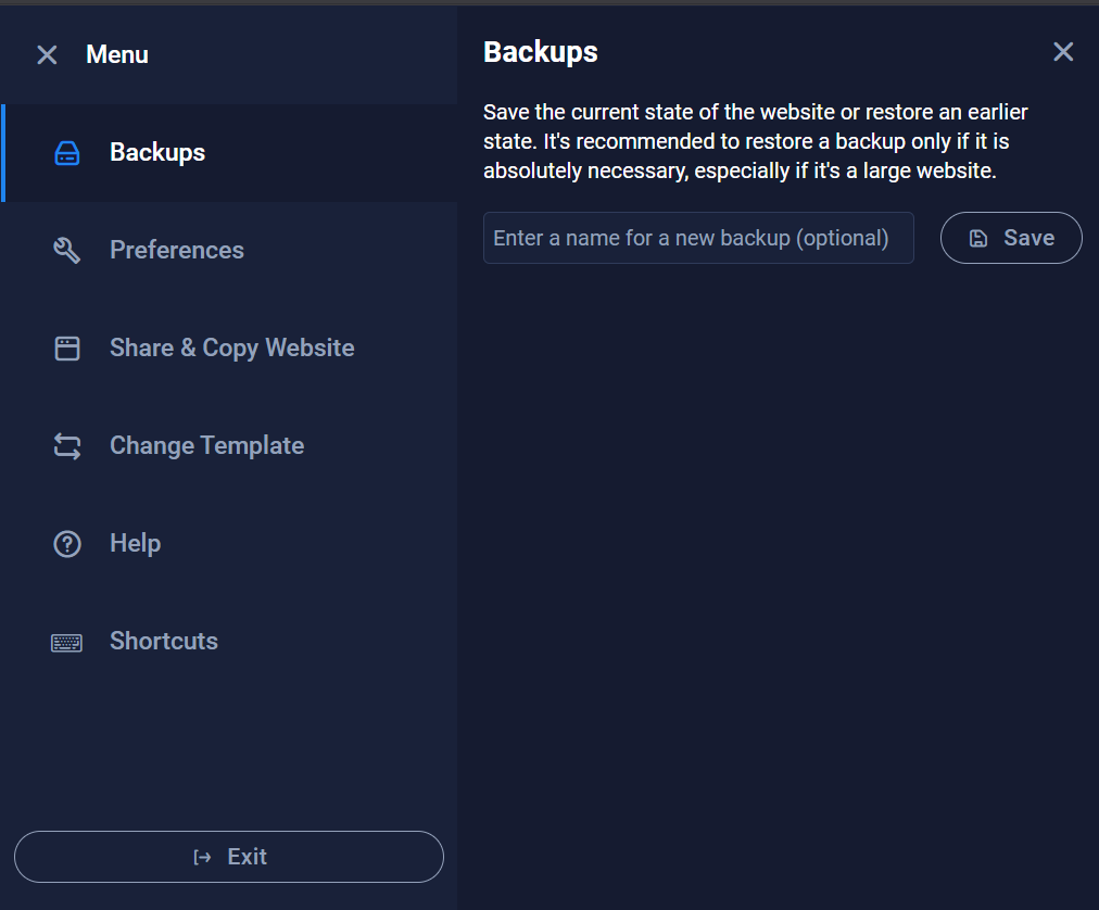 If you make a mistake or want to undo recent changes, Sitejet makes it easy to roll back to a previous version right from within the editor. Inside the Sitejet interface, open the menu and find the Backups option. There, you’ll see a list of automatically saved restore points created at different times, these snapshots include your site’s content and design. Simply select the version you want to revert to, and Sitejet will restore your website to that state instantly, letting you undo unwanted edits without leaving the builder.