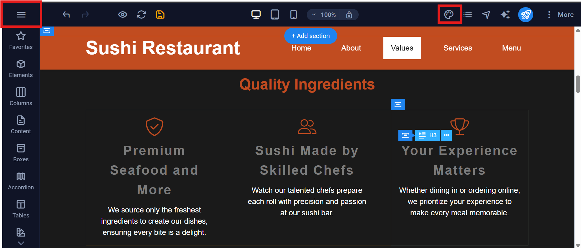 The editor works just like a modern website builder. On the left, you’ll find a toolbar with all the elements you can add: text boxes, images, videos, buttons, galleries, maps, contact forms, and more.