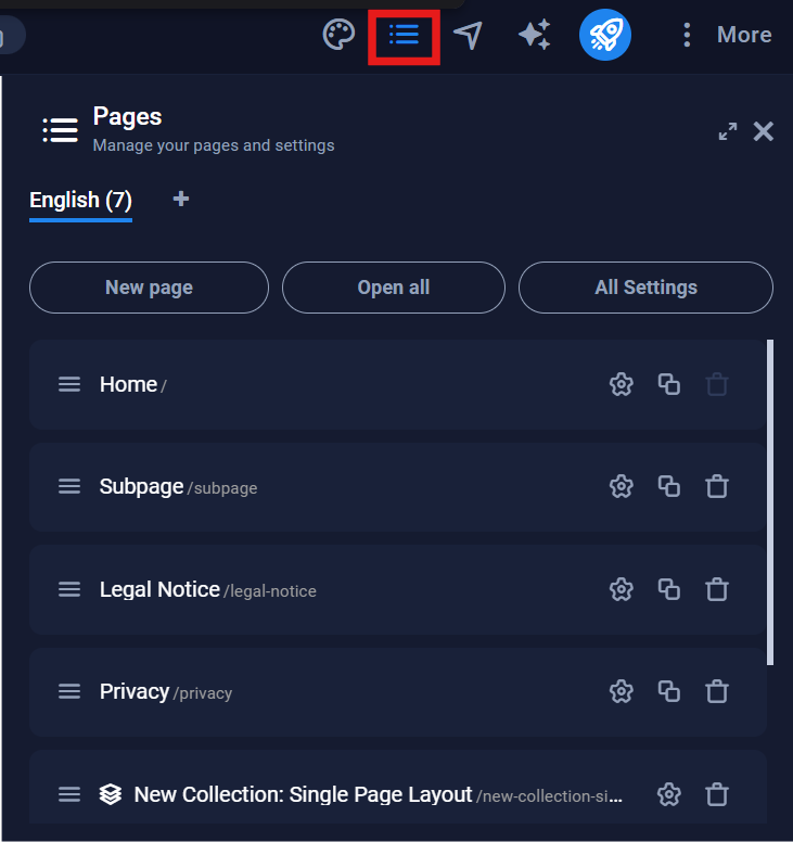 You can manage your site’s structure by opening the Pages section. Here, you can add new pages (like “Testimonials” or “Blog”), rename existing ones, and adjust SEO settings such as page titles and meta descriptions.