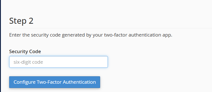 Once your app is configured, it will generate a six-digit code. Enter this code into the Security Code field in cPanel, then click Configure Two-Factor Authentication. A confirmation message will appear to indicate that 2FA has been successfully enabled.